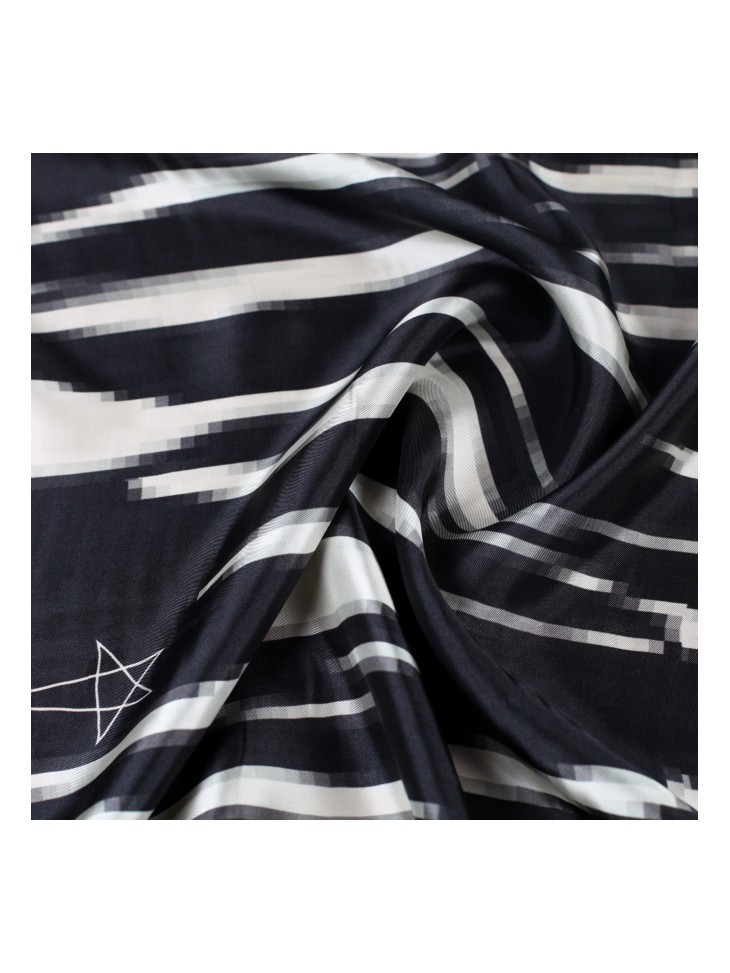 Gemusterte Seide mit „Pixel“- und illustrativen Sternenmustern.
