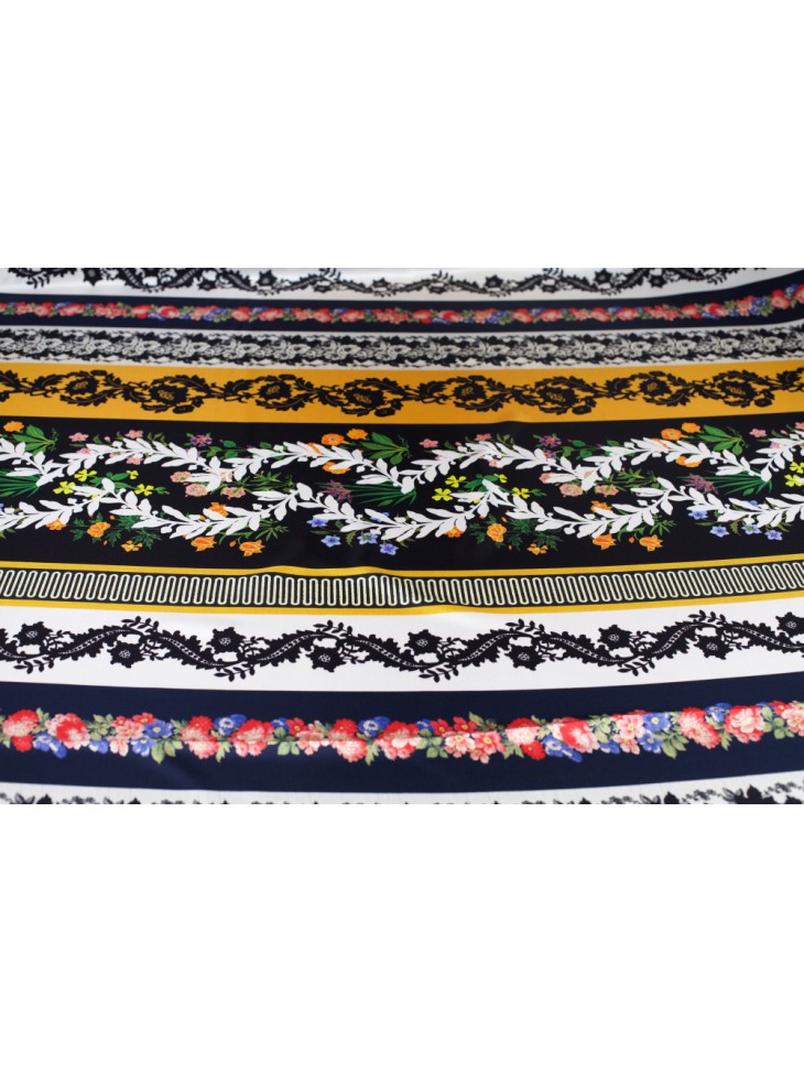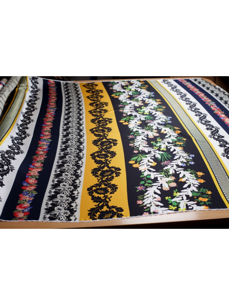 Seidenstoffe der OSCAR DE LA RENTA Kollektion mit horizontalen Streifen und Mustern bedruckt.