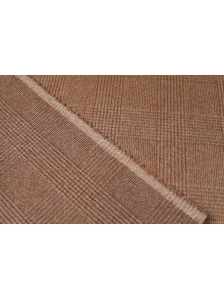 Kolor beżowy/kamelowy, delikatna tkanina w kratkę